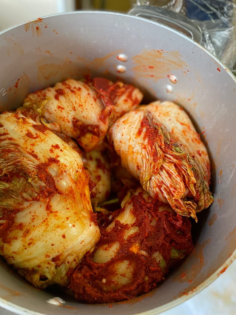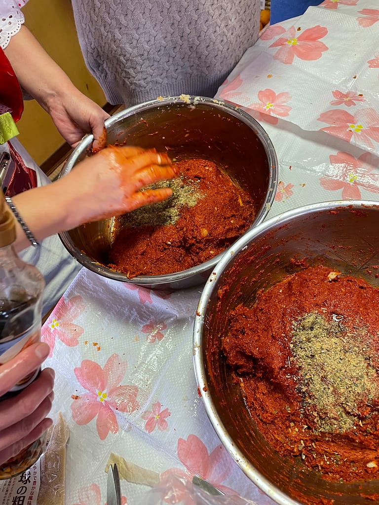 発酵料理研究家の大久保千恵子さんと一緒に本場の韓国キムチを作りました!やってみたい!というお手伝いの皆さまと共に愛情を込めて手作りしました。 味の要、白菜に塗り込むヤンニョムに使う野菜は全て無肥料無農薬。もちろん唐辛子も。驚いたことにクンクンと香りをかぐととてもいい匂い。そして混ぜても手がヒリヒリしない。そして国産はほとんど出回らないという、もはやマボロシといってもいい瀬戸内海のあみえび。 先生が塩辛(これだけでもご飯がススム)にしたものを加えて混ぜ混ぜ混ぜ… 『素手やんけ!』 とツッコミが入りそうですが手はもちろんしっかりと洗っておりますし、手のひらの常在菌がキムチにとっては旨味を引き出す大事な要素なのです白菜に塗って重ねてを繰り返し、くるっとまとめて『キムチ玉』に。